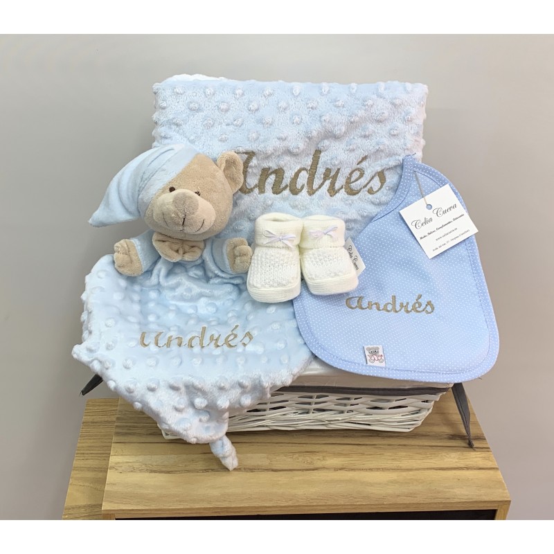 Canastilla 4 piezas: azul, rosa o beige. Manta + babero + dou dou + patucos