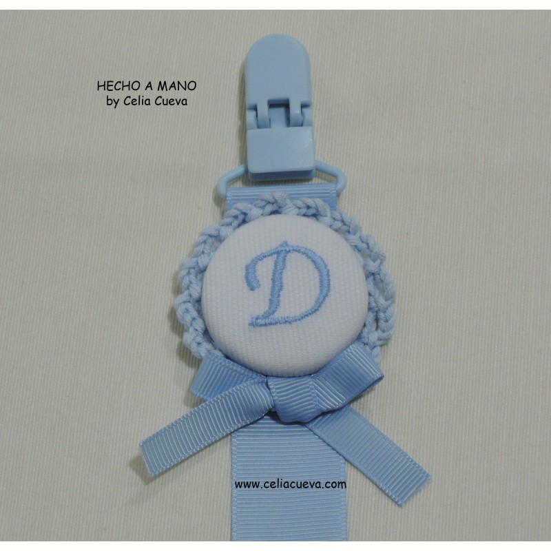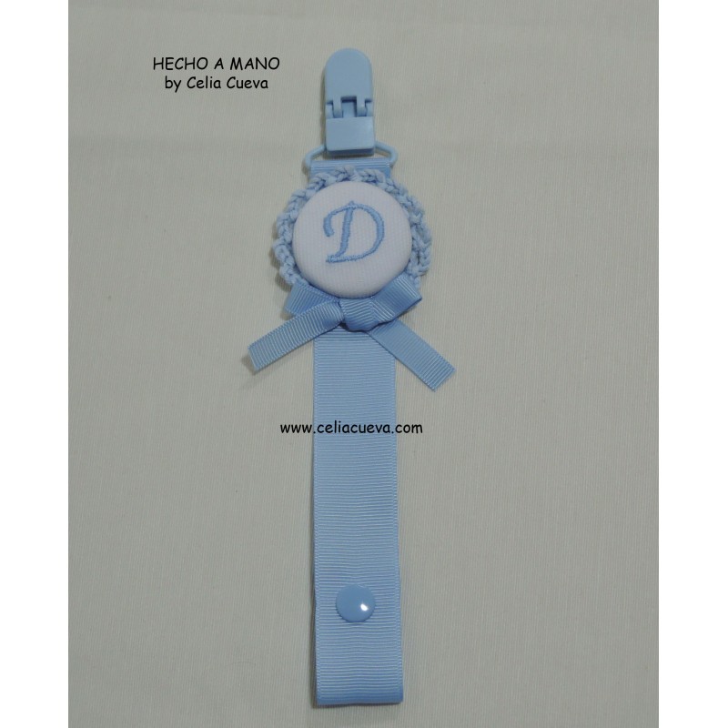 Pinza sujeta chupete o chupetero de color azul con la inicial del bebé bordada.